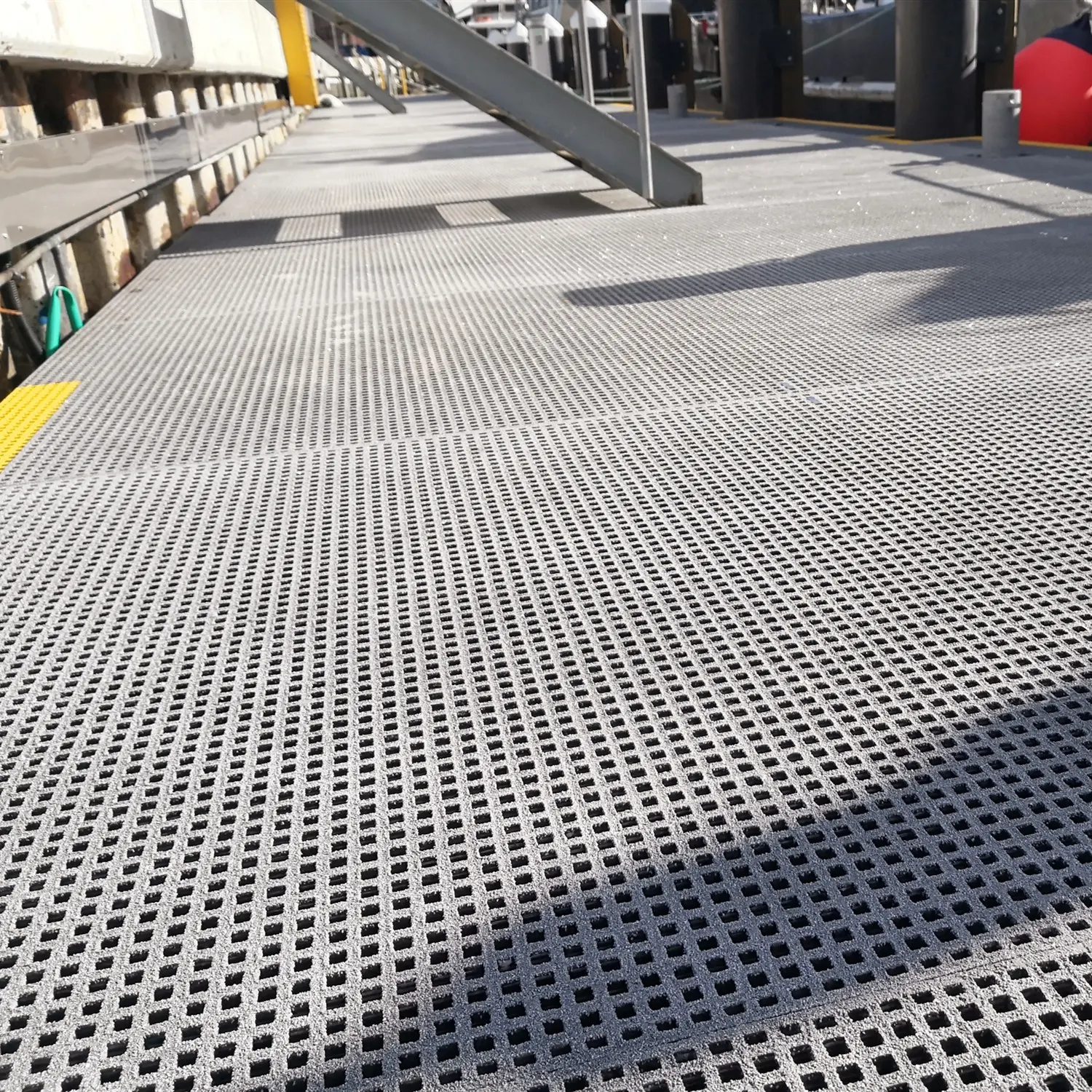 Sa maille 19×19 mm (passage réduit à 13×13 mm) garantit une surface sécurisée et confortable, idéale pour les zones publiques, passerelles, plateformes et allées piétonnes.